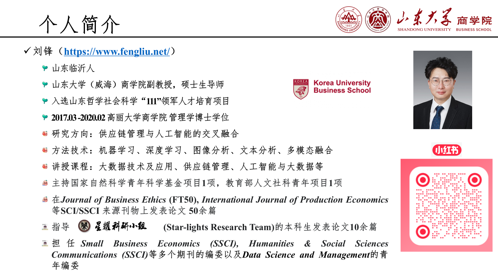 刘锋博士,山东临沂人,现任山东大学商学院副教授,硕士生导师,入选山东哲学社会科学“111”领军人才培育项目、山东大学(威海)青年学者未来计划,2020年获得高丽大学商学院博士学位。主要从事供应链管理与人工智能的交叉融合方向的研究,熟练掌握机器学习、深度学习、多模态融合等新兴技术,围绕数智化运营与供应链管理取得一系列研究成果,拓宽了供应链集中度、供应链透明度等相关理论,丰富了人工智能在经管学科的研究范式。在Journal of Business Ethics, International Journal of Production Economics, Decision Support Systems, Technological Forecasting and Social Change, Annalsof Operations Research, China Economic Review, Expert Systems with Applications, 《科学学研究》等SCI/SSCI/CSSCI来源刊物上发表论文50余篇,其中指导星耀科研小组 (Star-lights Research Team)的本科生在国际高水平期刊发表论文10余篇,小组成员卢灿(22会计)同学获得了山东大学第二届青年学生基础研究项目培育计划(“青苗”专项)的立项。主持国家自然科学基金青年项目1项,教育部人文社科青年项目1项,担任Small Business Economics (SSCI), Humanities & Social Sciences Communications (SSCI)等多个期刊的编委以及Data Science and Management的青年编委。2020年获得了工业和信息部颁发的<大数据分析师高级证书>,具备大数据采集、分析、教学等专项技术水平。